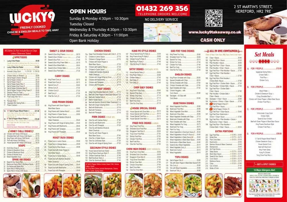 Lucky 9 Takeaway sits in a vibrant corner of Hereford, easily accessible with ample parking right outside. The location boasts a wheelchair-accessible entrance and seating, ensuring everyone can enjoy a meal here. This Chinese takeaway thrives on the local love for fresh, flavorful dishes, where diners can either take their food home or opt for some casual dining inside. While they don't offer delivery, many patrons swear that picking up the food adds to the experience; it fosters that excitement for the meal ahead. Due to the restaurant's focus on quality ingredients and swift preparation, customers often find themselves returning time and again. Friendly staff and their community engagement, like providing complimentary spring rolls, showcase the heart behind the takeaway. From the enjoyment of peking duck to the buzz of local conversation, Lucky 9 epitomizes the warmth of Hereford's dining scene.